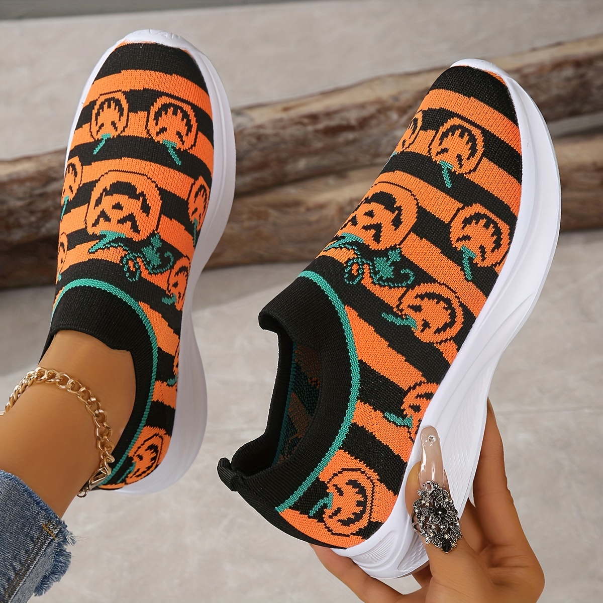 Women's Ghost Face Pumpkin Pattern Shoes, Halloween Slip On Low Top Sock Sneakers, Casual Breathable Walking Trainers